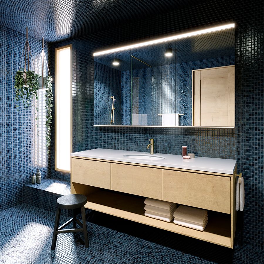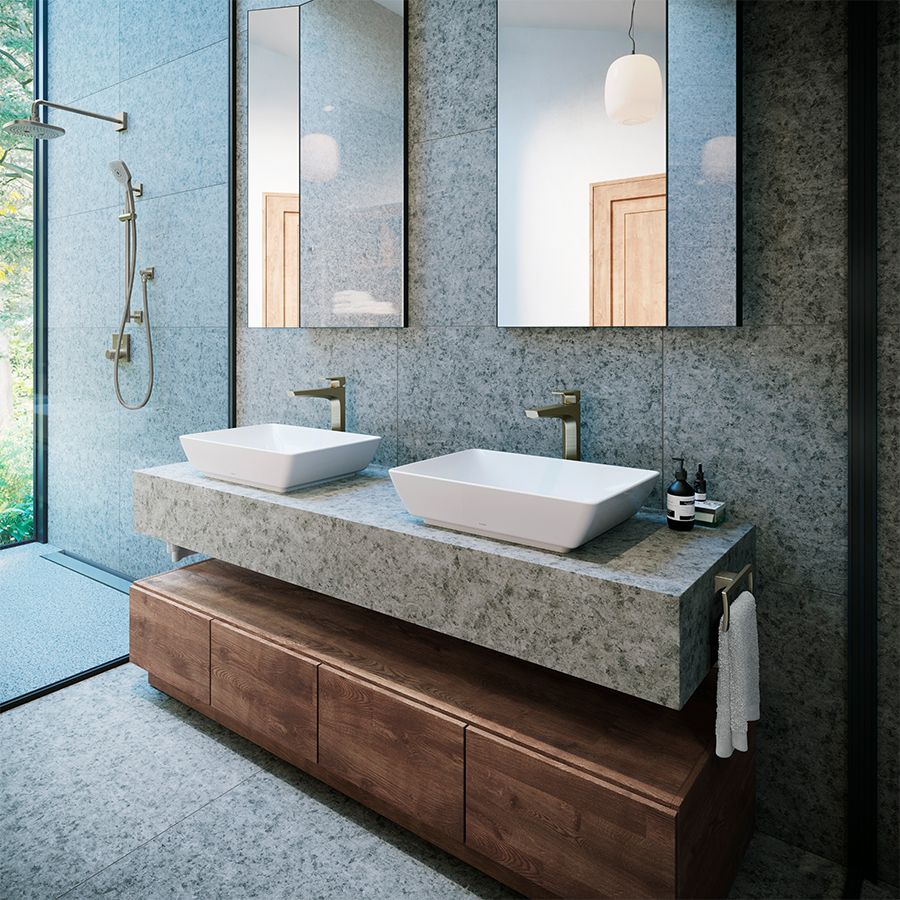 Phòng tắm sang trọng này được bao bọc bởi cửa kính trong suốt mang lại cảm giác như căn phòng đang hòa mình vào tầm nhìn tráng lệ của những tòa nhà chọc trời. Tông màu xám nhạt hòa quyện với màu gỗ, vòi rửa màu đen đan xen đường cong tinh tế của bàn cầu. Tất cả tạo nên một điểm nhấn sắc nét cho tổng thể căn phòng. Sự hòa trộn giữa các khối màu càng tô đậm tính thẩm mỹ cho không gian.