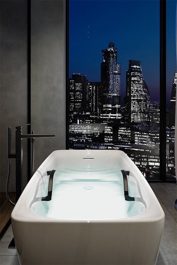 Phòng tắm mang đến một không gian sang trọng bậc nhất cho những chủ nhân có gu thẩm mỹ tinh tế, những người yêu thích ngắm nhìn khung cảnh về đêm của đô thị như thể họ là những chủ nhân có thể bao trọn tầm nhìn thành phố.