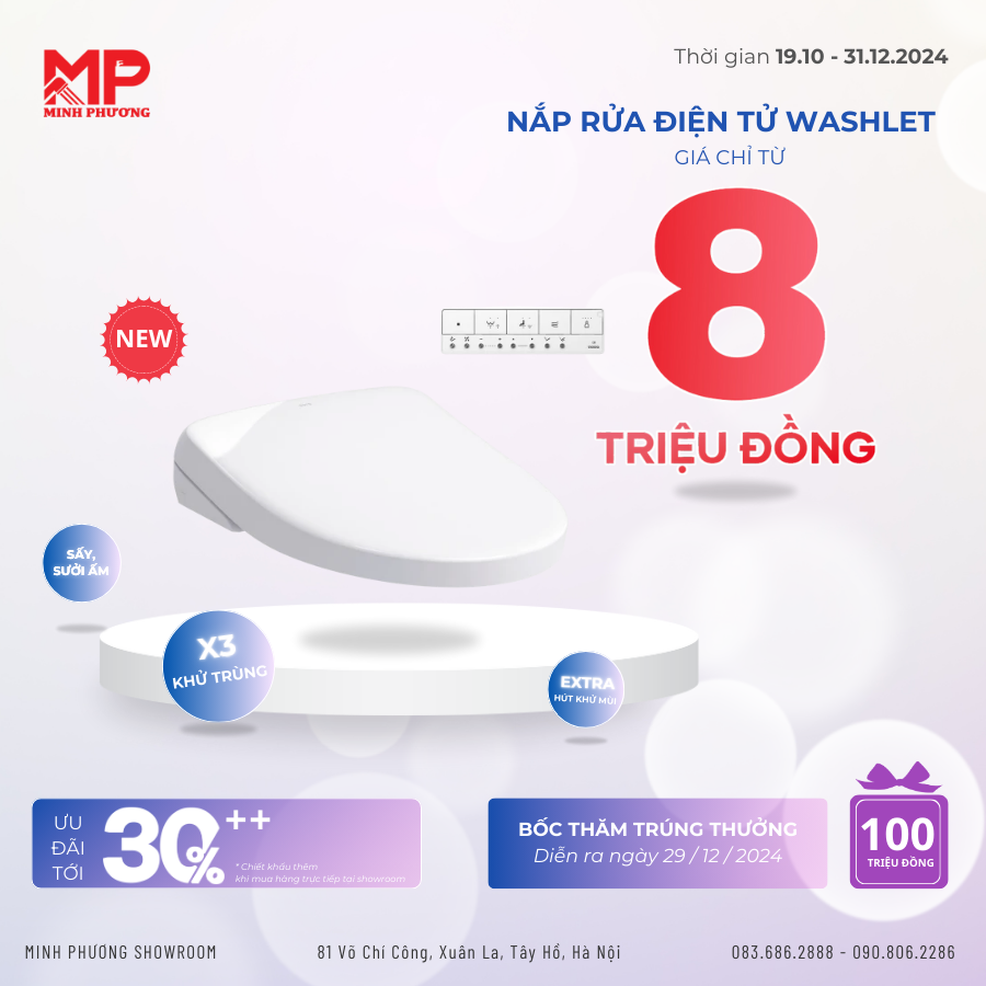 MinhPhươngShowroom hiện đang áp dụng chương trình ưu đãi lên đến 30%++ đối với đơn hàng Nắp rửa điện tử, Bàn cầu thông minh cùng nhiều phần quà và ưu đãi giá trị khác khi mua hàng trong dịp cuối năm.
