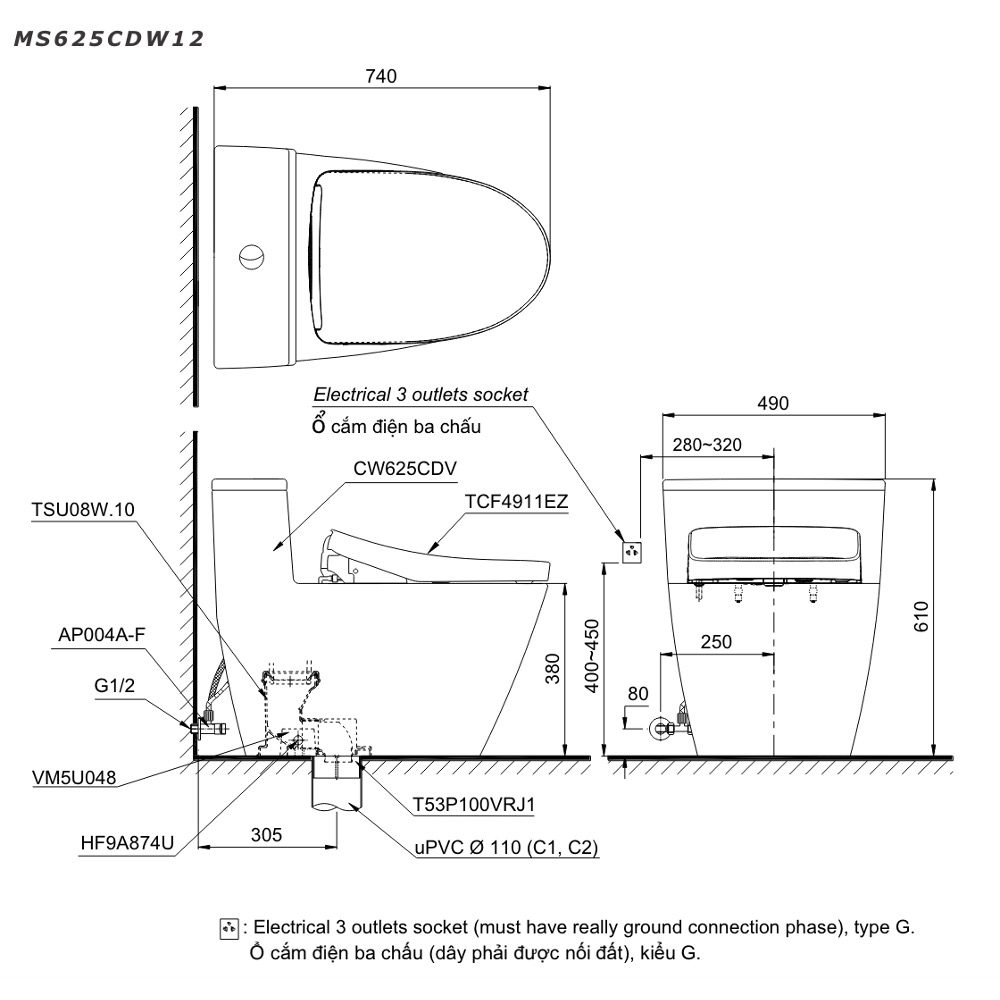 Bàn cầu 1 khối nắp điện tử TOTO MS625CDW12