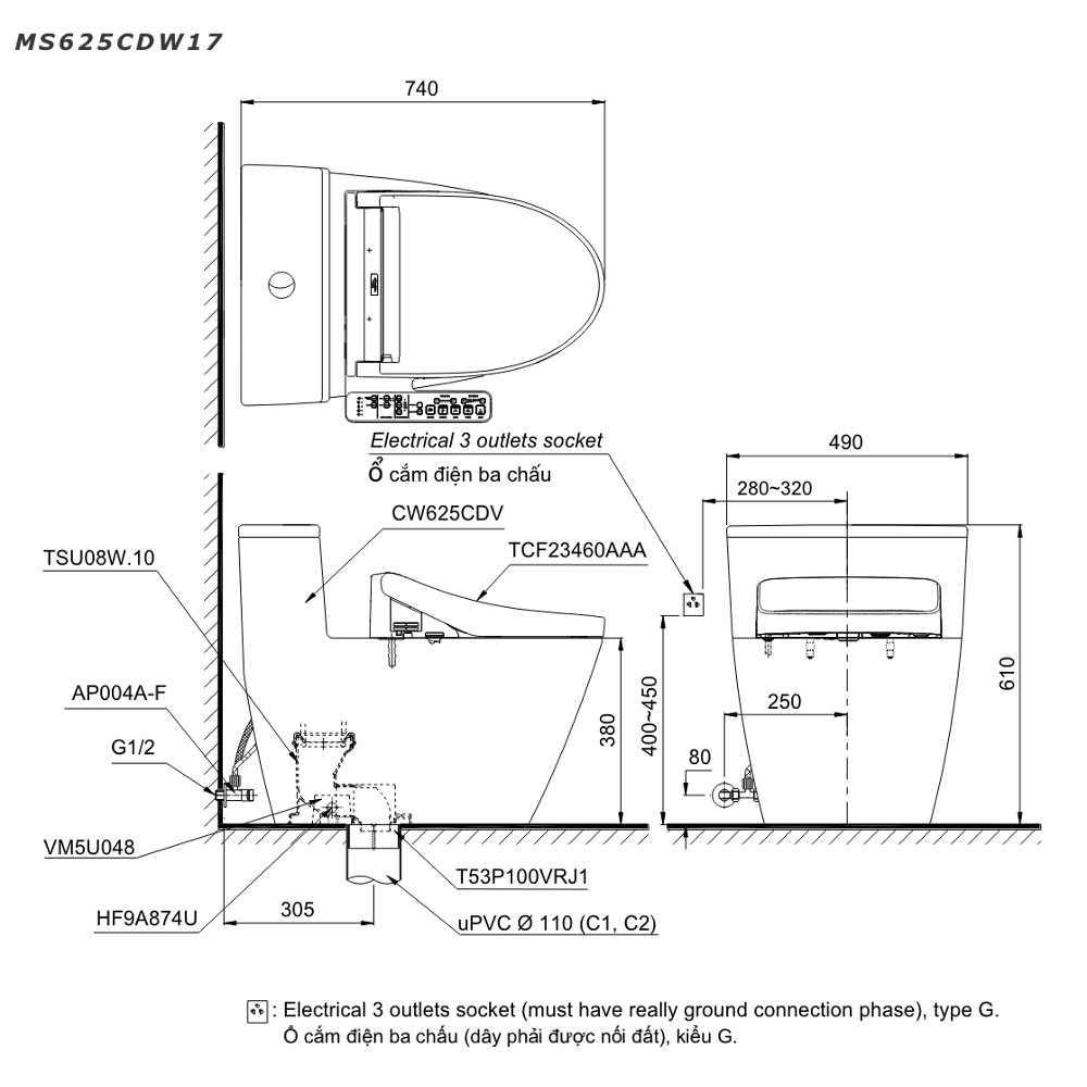 • Tính năng công nghệ nổi trội của bàn cầu 1 khối MS625CDW17 kết hợp nắp rửa điện tử WASHLET dòng C2 TCF23460AAA (giấu dây):
