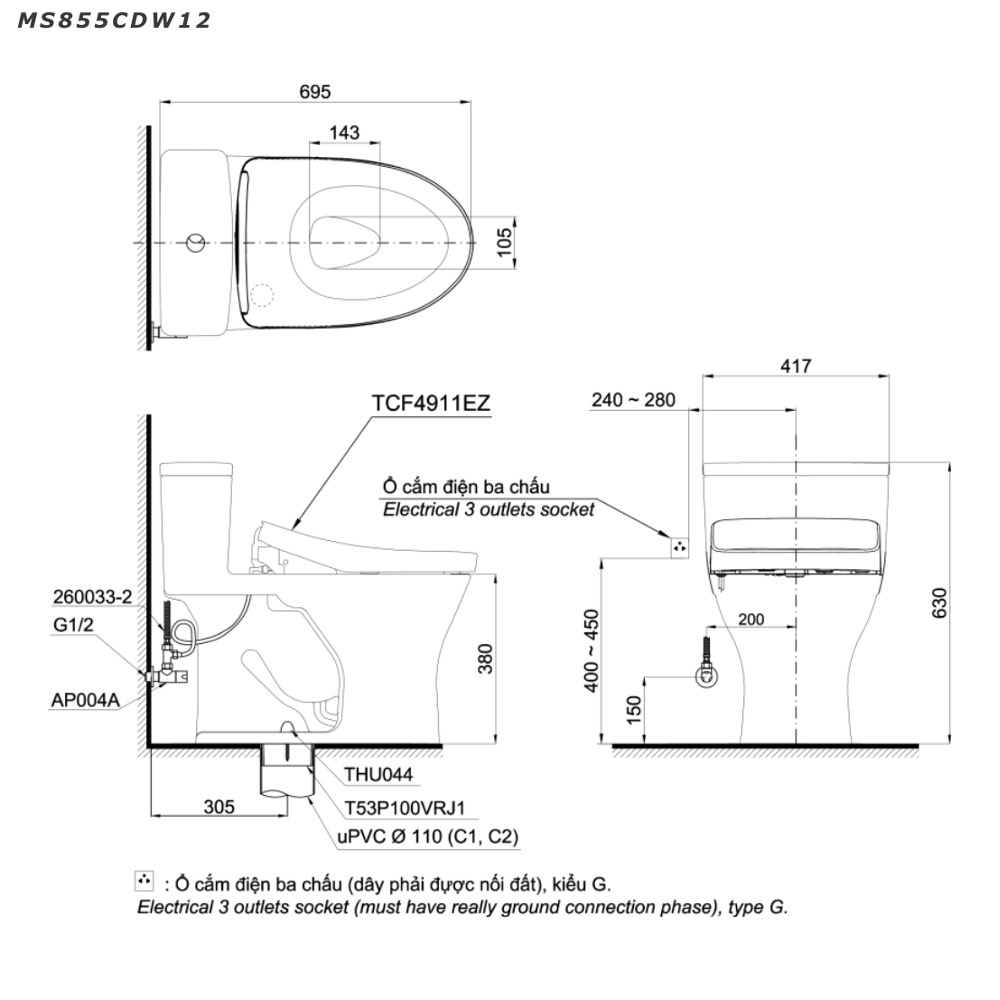 • Bồn cầu TOTO 1 khối MS855CDW12 nắp rửa điện tử với Thiết kế thân kín, vành kín tiện dụng cho việc vệ sinh hàng ngày.