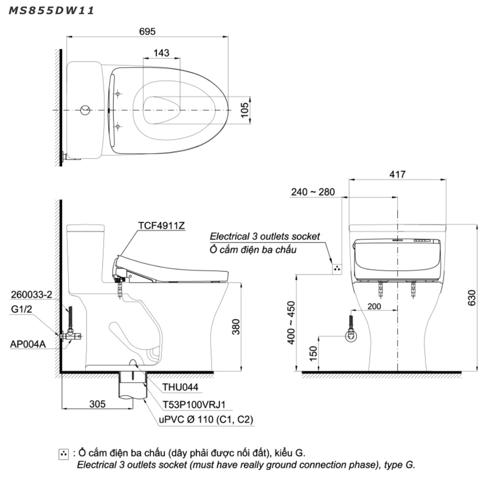 Mô tả sản phẩm Bàn cầu 1 khối nắp điện tử TOTO MS855DW11