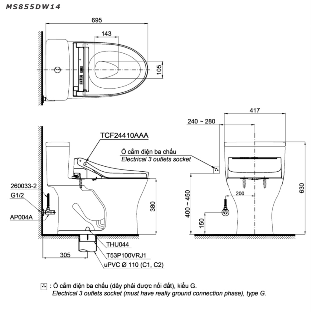 Mô tả sản phẩm Bàn cầu 1 khối nắp điện tử TOTO MS855DW14
