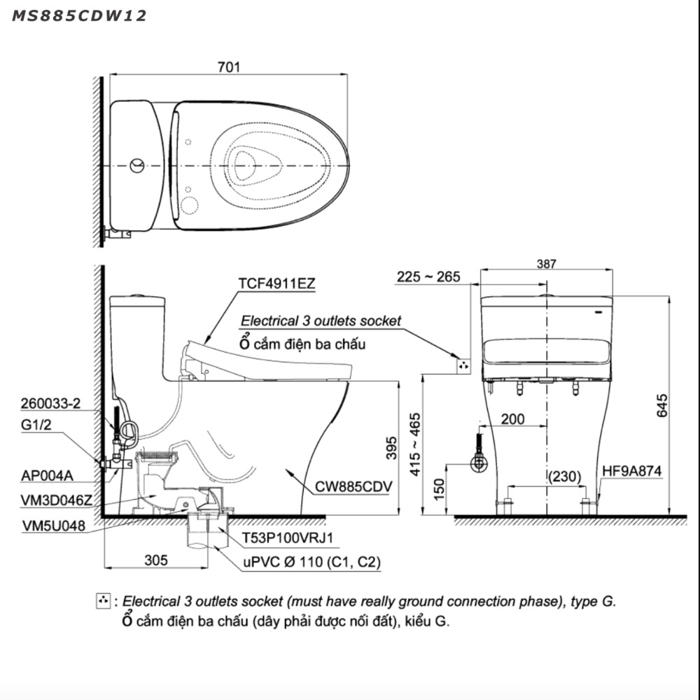 Mô tả sản phẩm Bàn cầu 1 khối nắp điện tử TOTO MS885CDW12