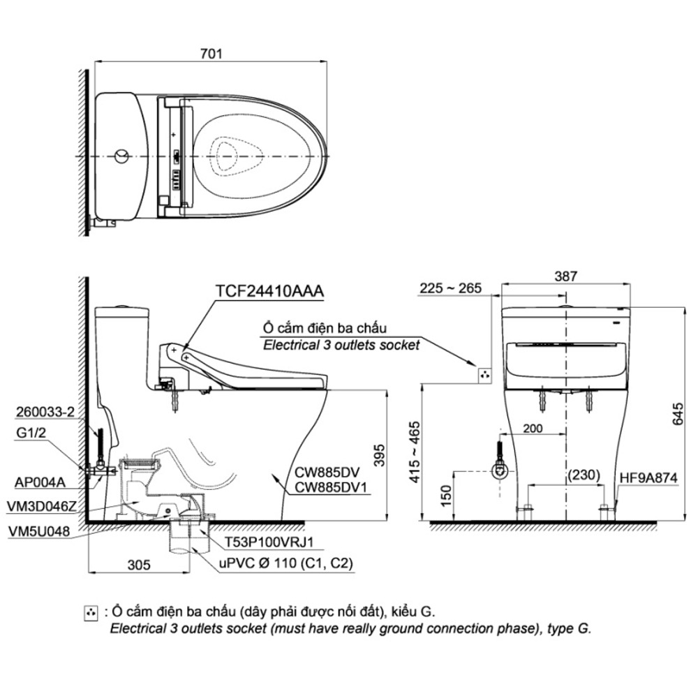 Mô tả sản phẩm Bàn cầu 1 khối nắp điện tử TOTO MS885DW14