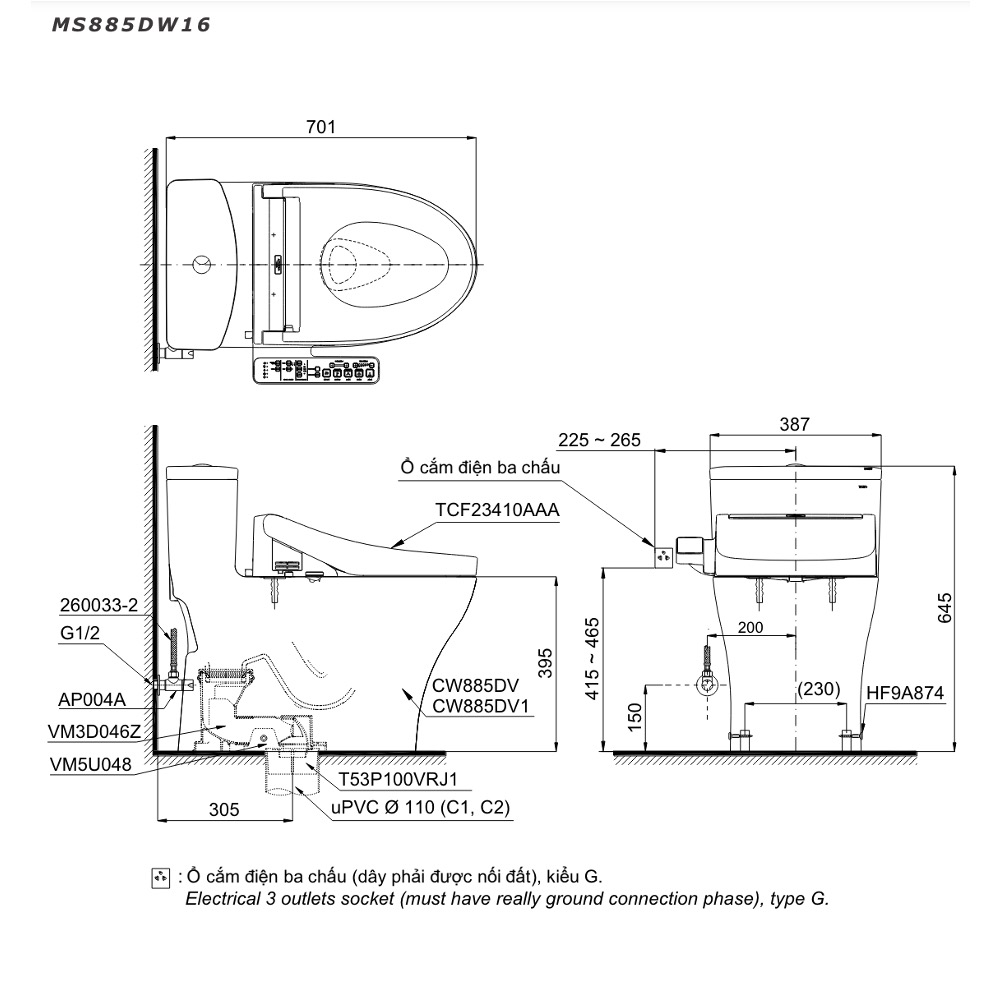 Mô tả sản phẩm Bàn cầu 1 khối nắp điện tử TOTO MS885DW16