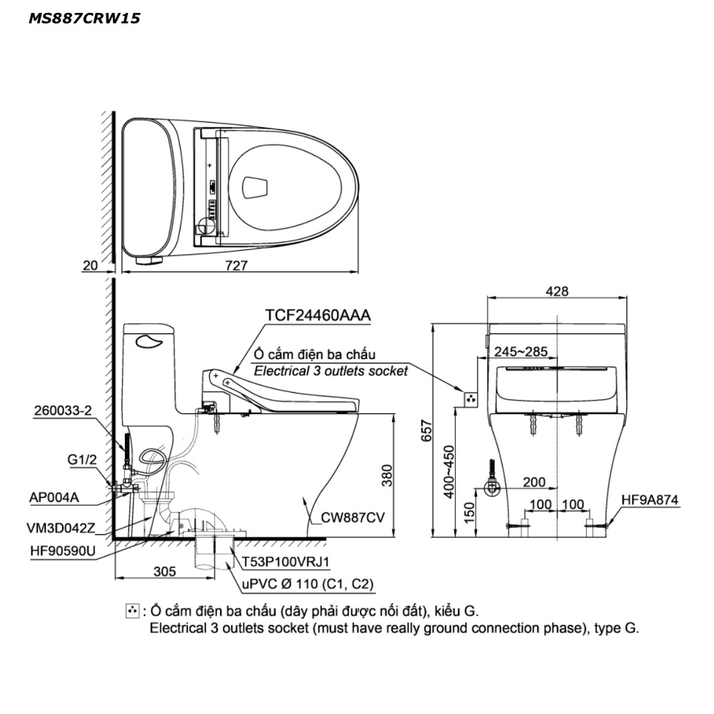 Mô tả sản phẩm Bàn cầu 1 khối nắp điện tử TOTO MS887CRW15