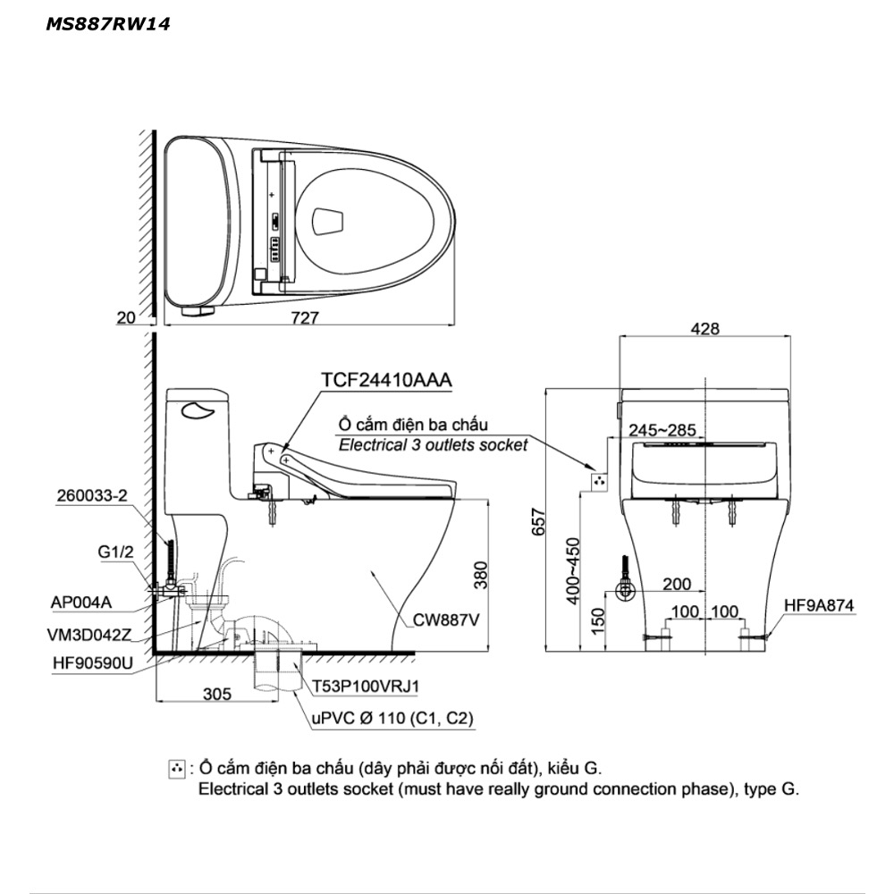 Mô tả sản phẩm Bàn cầu 1 khối nắp điện tử TOTO MS887RW14