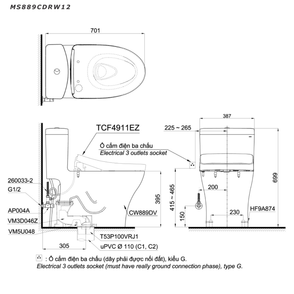 Mô tả sản phẩm Bàn cầu 1 khối Sản phẩm điện tử TOTO MS889CDRW12