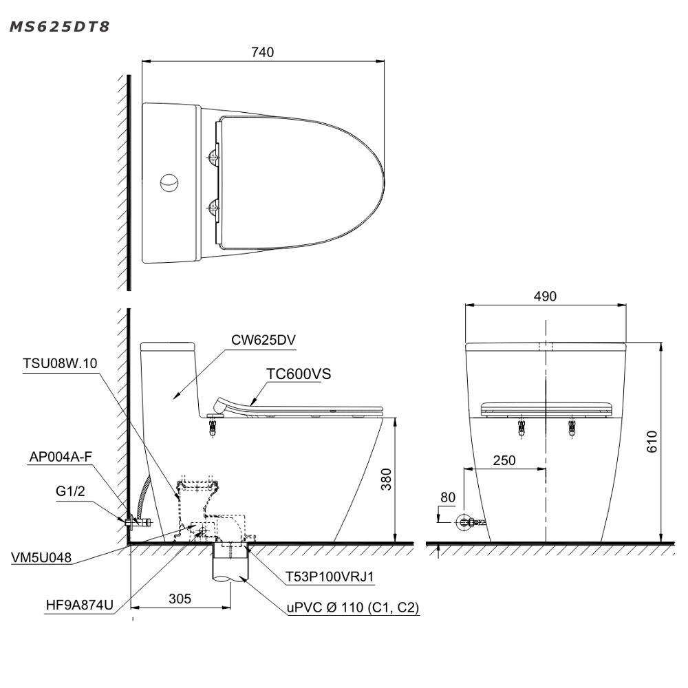 • Bàn cầu một khối MS625DT8 kết hợp nắp đóng êm TC600VS không chỉ tiện dụng, dễ dàng lắp đặt mà có nhiều tính năng hiện đại.