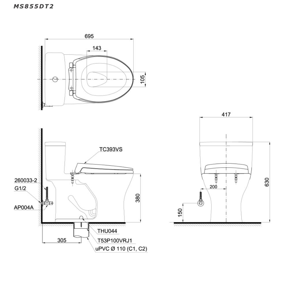 Mô tả sản phẩm Bàn cầu 1 khối nắp đóng êm TOTO MS855DT2