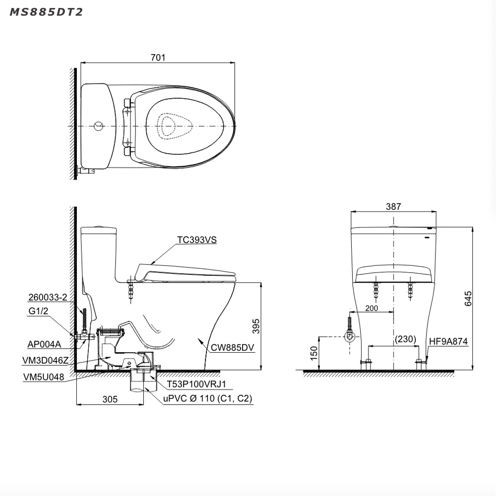 Mô tả sản phẩm Bàn cầu 1 khối nắp đóng êm TOTO MS885DT2