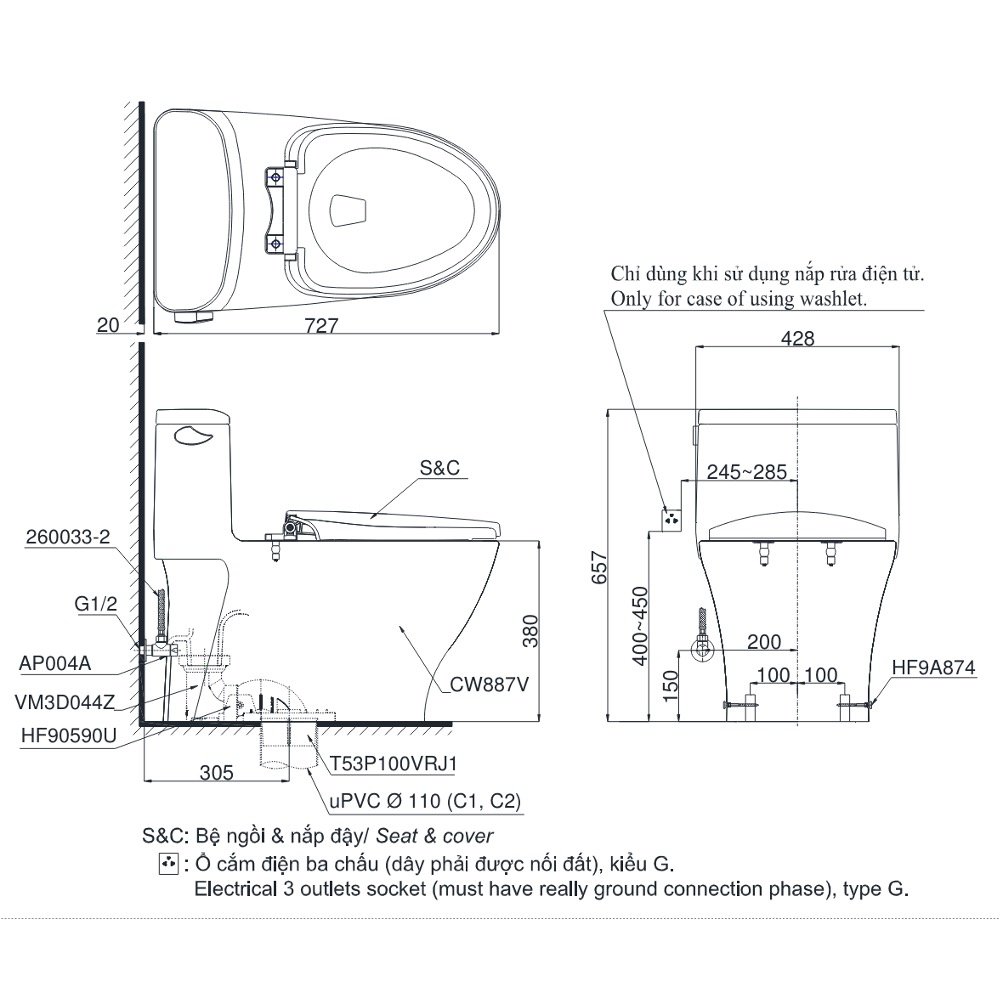 • Nắp đóng êm, Phù hợp lắp đặt với nắp rửa điện tử WASHLET (tùy chọn).