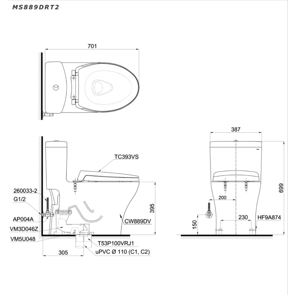 • Bàn cầu vệ sinh một khối TOTO MS889DRT2 kết hợp với nắp đóng êm TC393VS có thiết kế góc cạnh, vững chắc, đường nét tân tiến và phù hợp nhiều không gian nhà tắm.