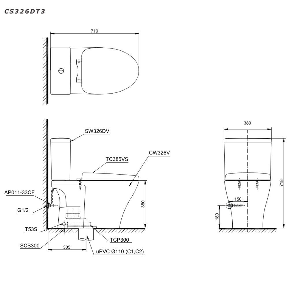 Mô tả sản phẩm Bàn cầu 2 khối nắp đóng êm TOTO CS326DT3