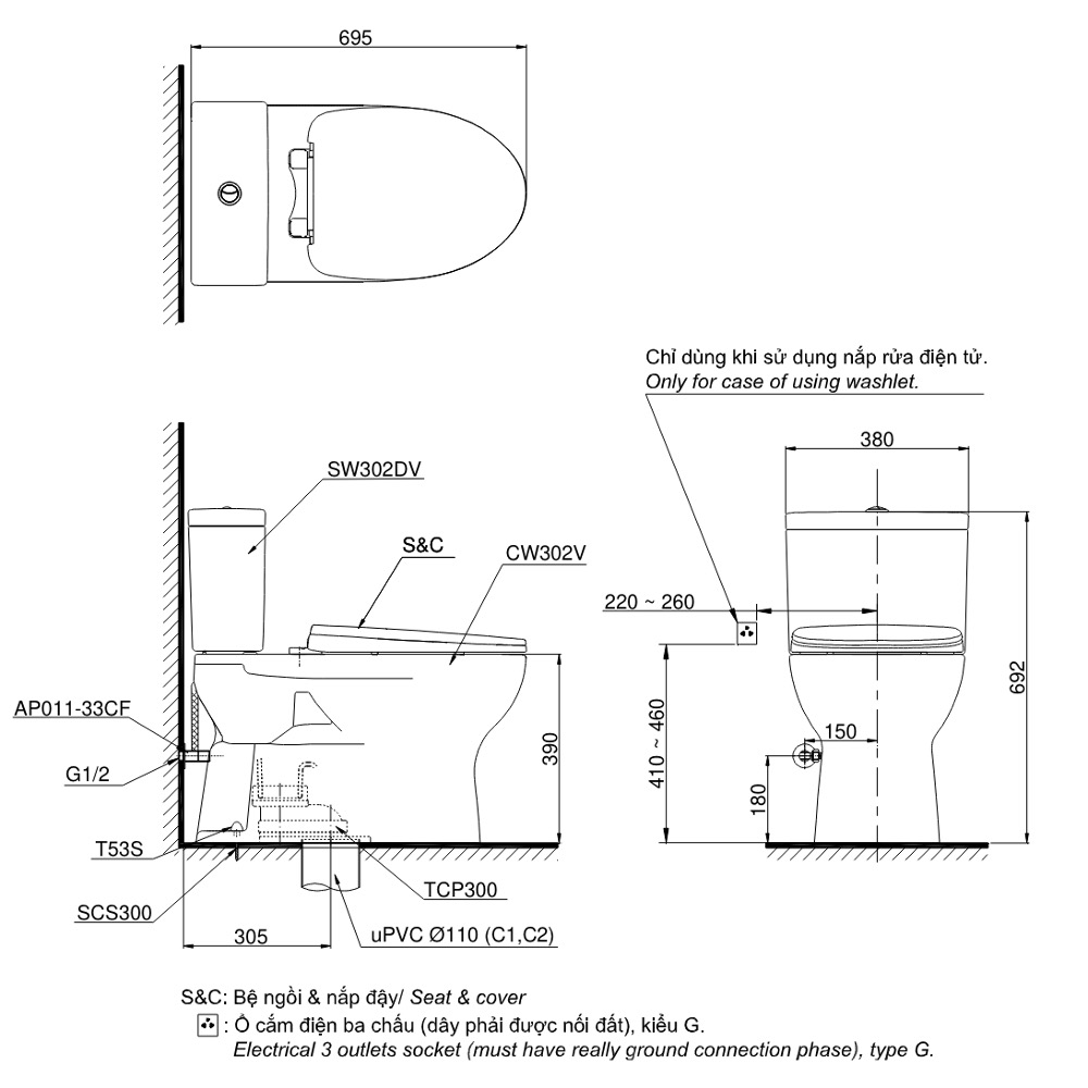 Mô tả sản phẩm Bàn cầu 2 khối nắp điện tử TOTO CS302DW11