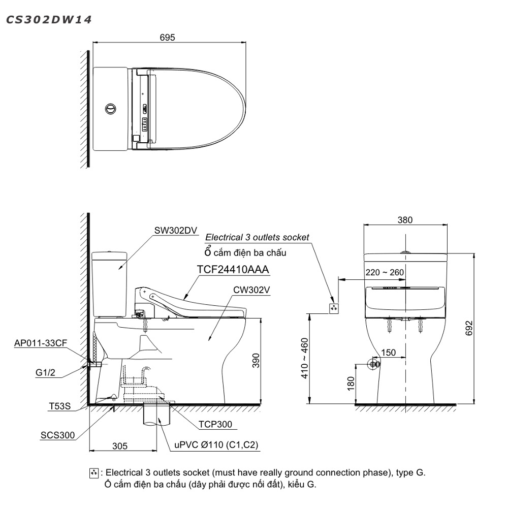 Mô tả sản phẩm Bàn cầu 2 khối nắp điện tử TOTO CS302DW14