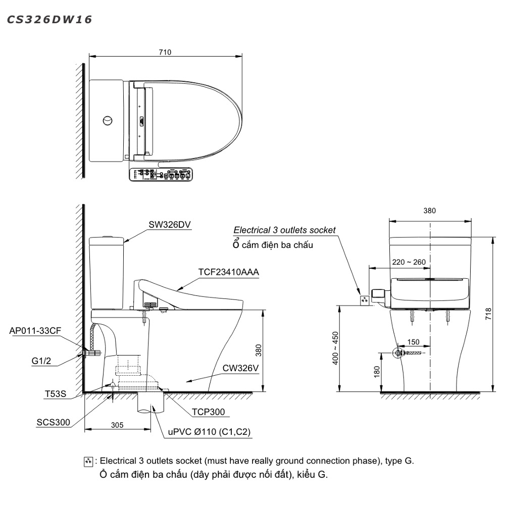 Bàn cầu hai khối CS326DW16 kèm nắp rửa điện tử WASHLET dòng C2 Thiết kế của bàn cầu hai khối CS326 kết hợp nắp rửa điện tử WASHLET dòng C2 TCF23410AAA vô cùng hiện đại và trang nhã. Sản phẩm có vành kín, thân dài không những đảm bảo tính vệ sinh, mà còn có tính thẩm mỹ hơn so với các loại bàn cầu truyền thống.