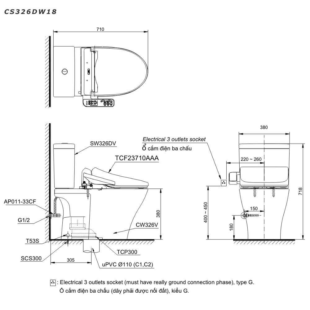 Mô tả sản phẩm Bàn cầu 2 khối nắp điện tử TOTO CS326DW18