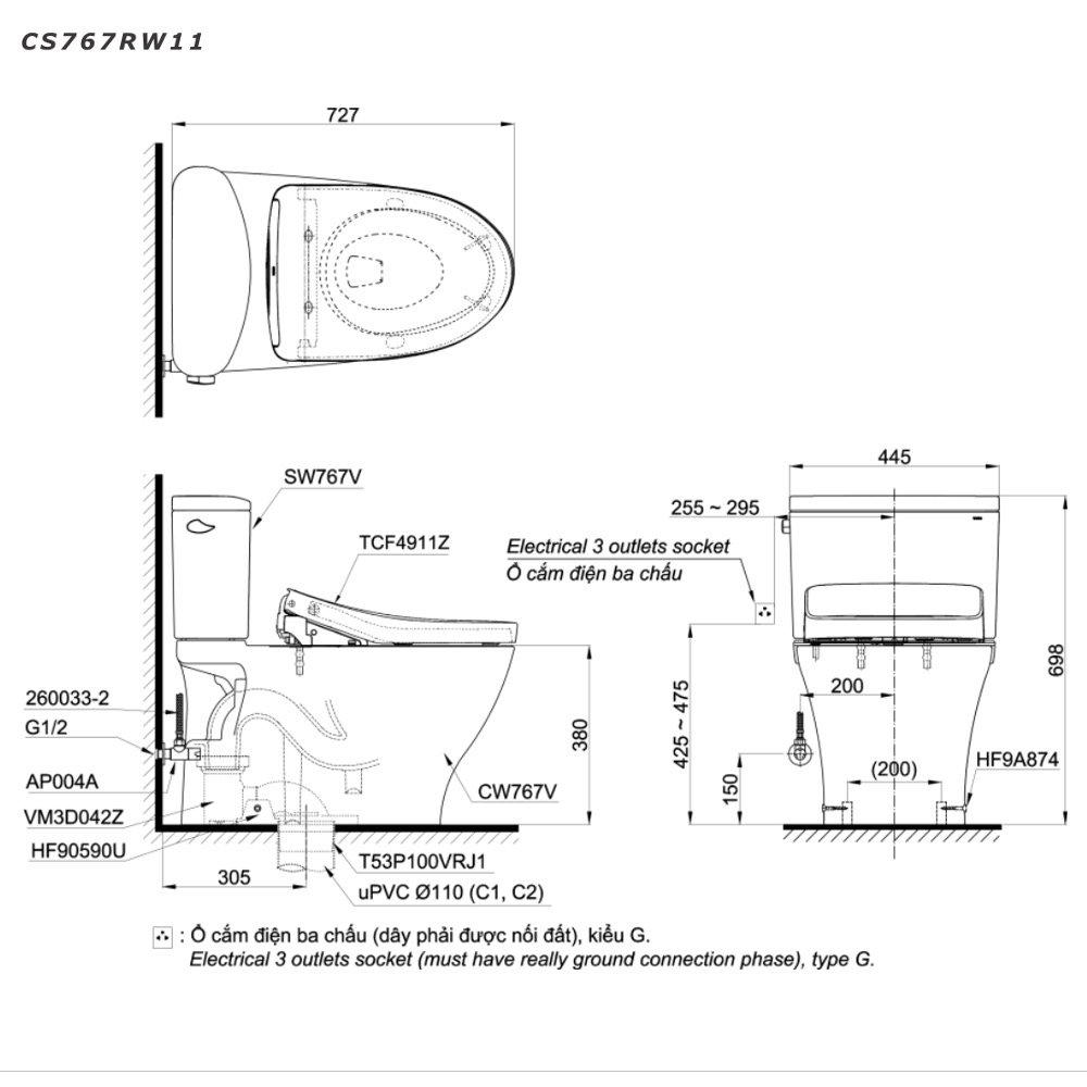 Mô tả sản phẩm Bàn cầu 2 khối nắp điện tử TOTO CS767RW11