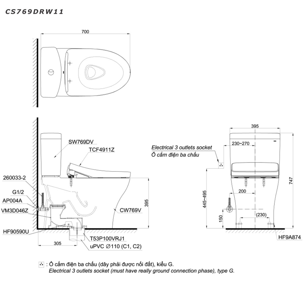 Mô tả sản phẩm Bàn cầu 2 khối nắp điện tử TOTO CS769DRW11