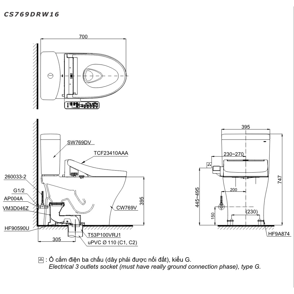 Mô tả sản phẩm Bàn cầu 2 khối nắp điện tử TOTO CS769DRW16