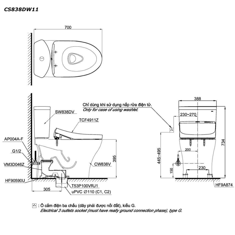 Mô tả sản phẩm Bàn cầu 2 khối nắp điện tử TOTO CS838DW11