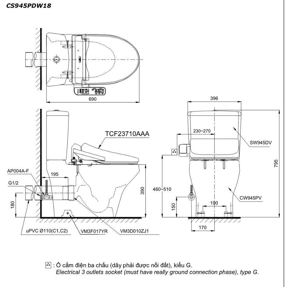 Mô tả sản phẩm Bàn cầu 2 khối nắp điện tử TOTO CS945PDW18