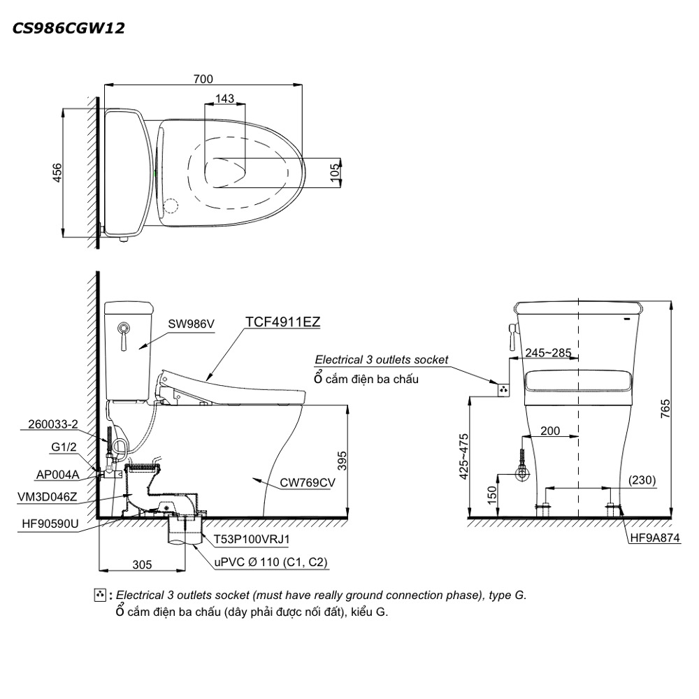 Mô tả sản phẩm Bàn cầu 2 khối nắp điện tử TOTO CS986CGW12