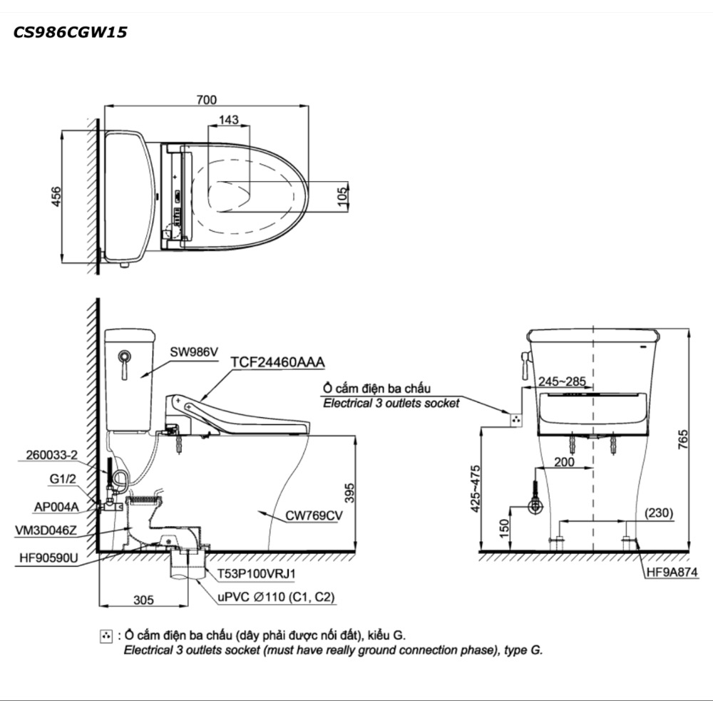 Mô tả sản phẩm Bàn cầu 2 khối nắp điện tử TOTO CS986CGW15