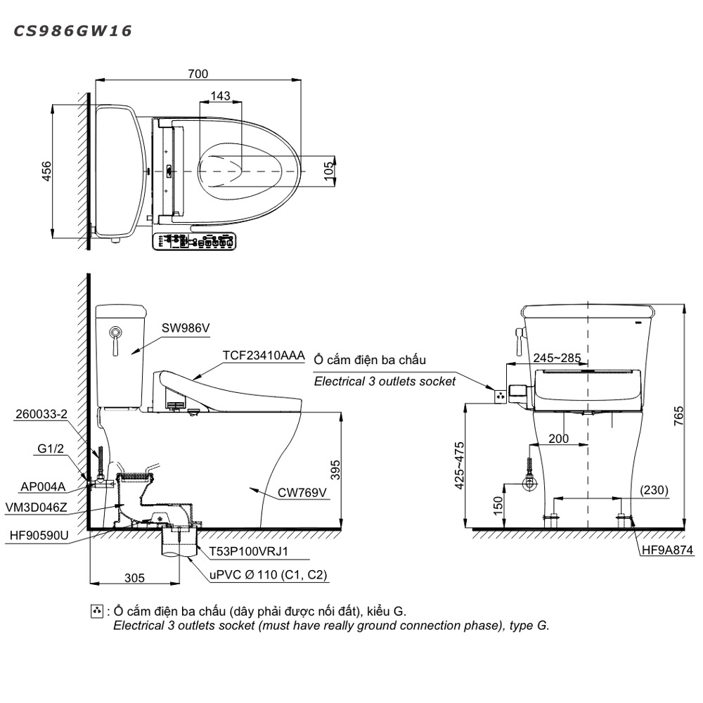 Mô tả sản phẩm Bàn cầu 2 khối nắp điện tử TOTO CS986GW16