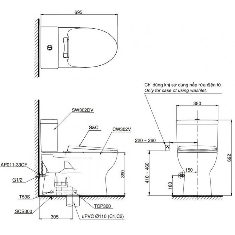 Mô tả sản phẩm Bàn cầu 2 khối nắp rửa cơ TOTO CS302DE2