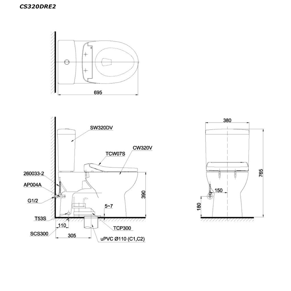 - Bồn cầu nắp rửa cơ CS320DRE2 tích hợp với vòi rửa nước lạnh, bồn cầu hai khối kết hợp nắp rửa cơ TCW07S giúp cung cấp sự sạch sẽ và tiện lợi, tạo điều kiện thuận lợi cho việc vệ sinh cá nhân.