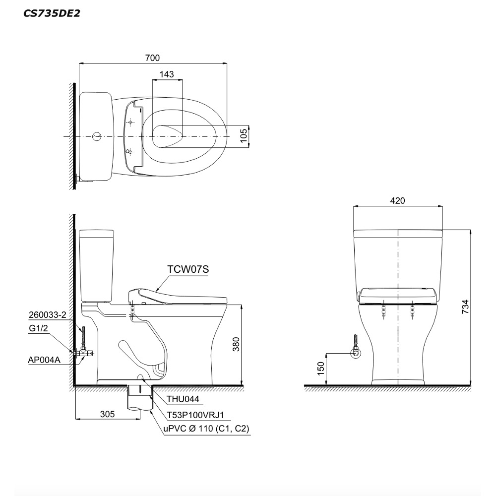 Mô tả sản phẩm Bàn cầu 2 khối nắp rửa cơ TOTO CS735DE2