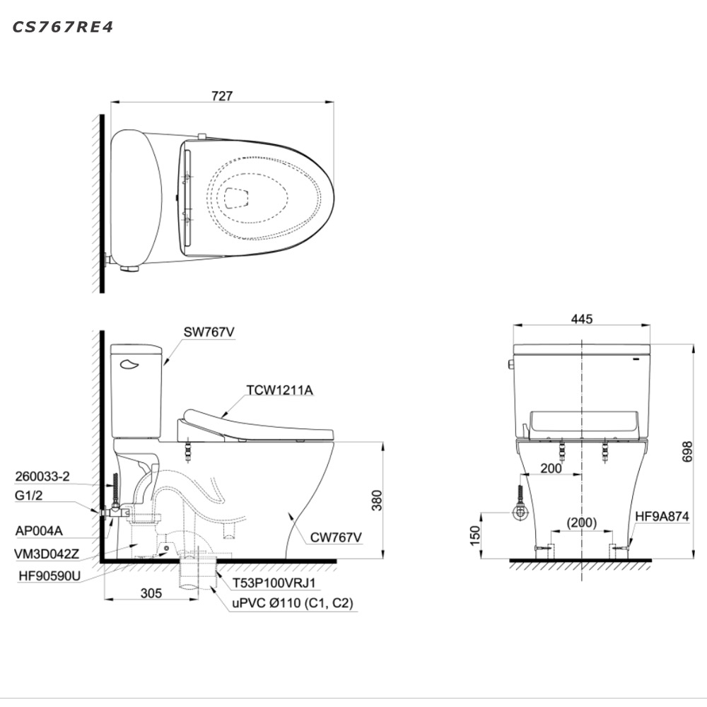 Mô tả sản phẩm Bàn cầu 2 khối nắp rửa cơ TOTO CS767RE4