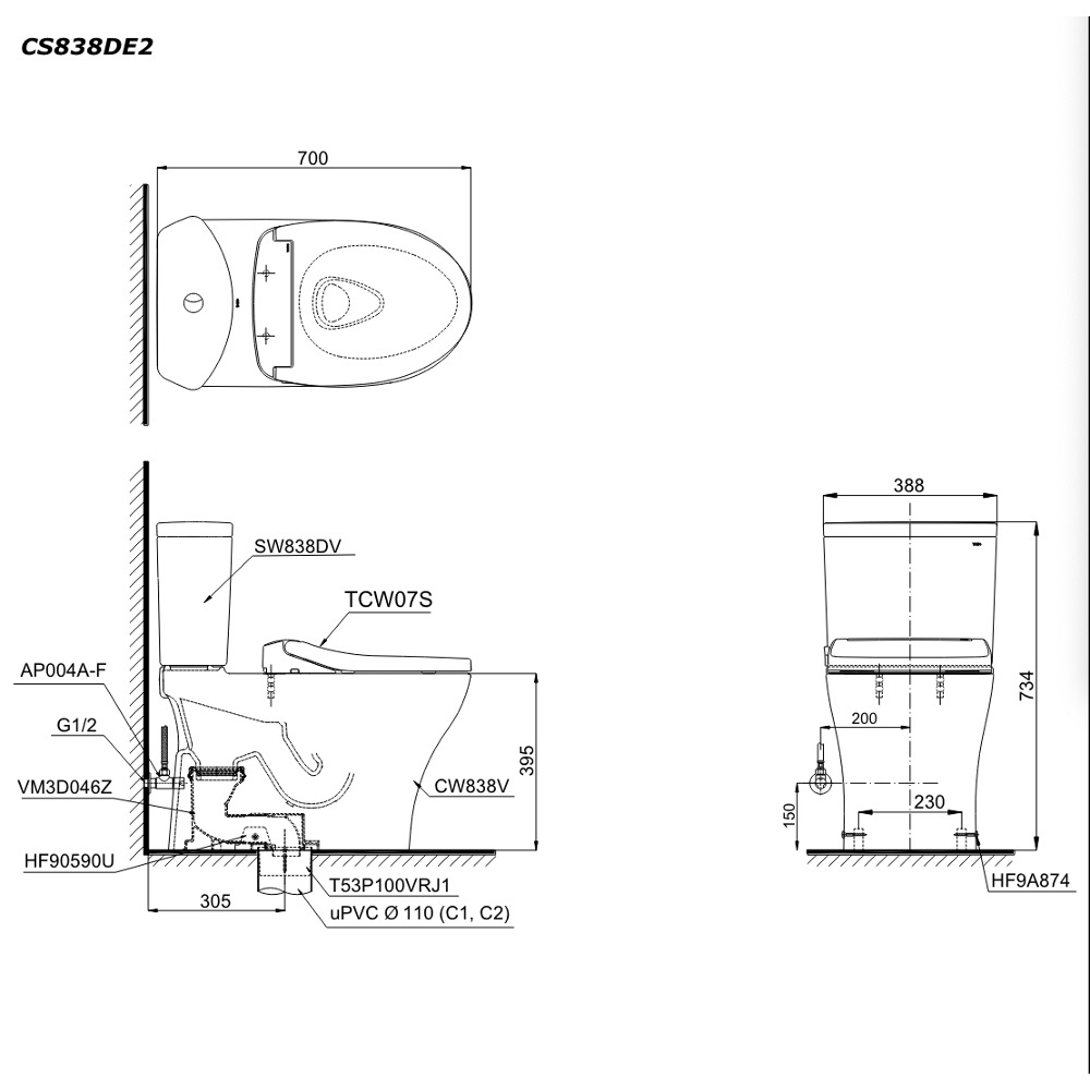 Mô tả sản phẩm Bàn cầu 2 khối nắp rửa cơ TOTO CS838DE2