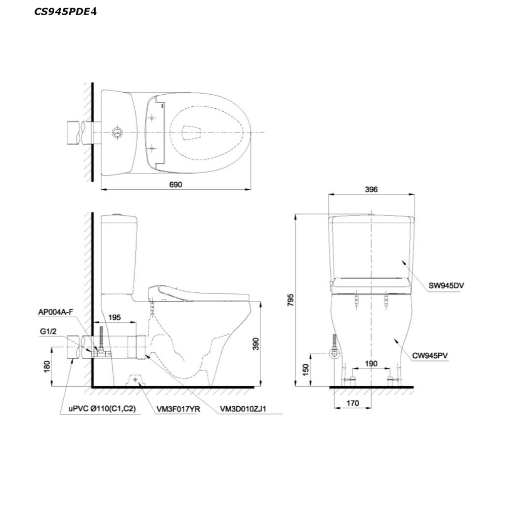 Mô tả sản phẩm Bàn cầu 2 khối nắp rửa cơ TOTO CS945PDE4