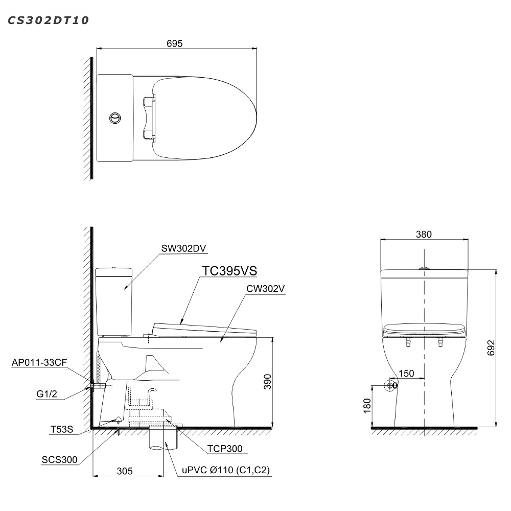 - Thiết kế tiêu chuẩn dễ dàng lắp đặt với các loại nắp rửa cơ và nắp rửa điện tử phục vụ nhu cầu khách hàng