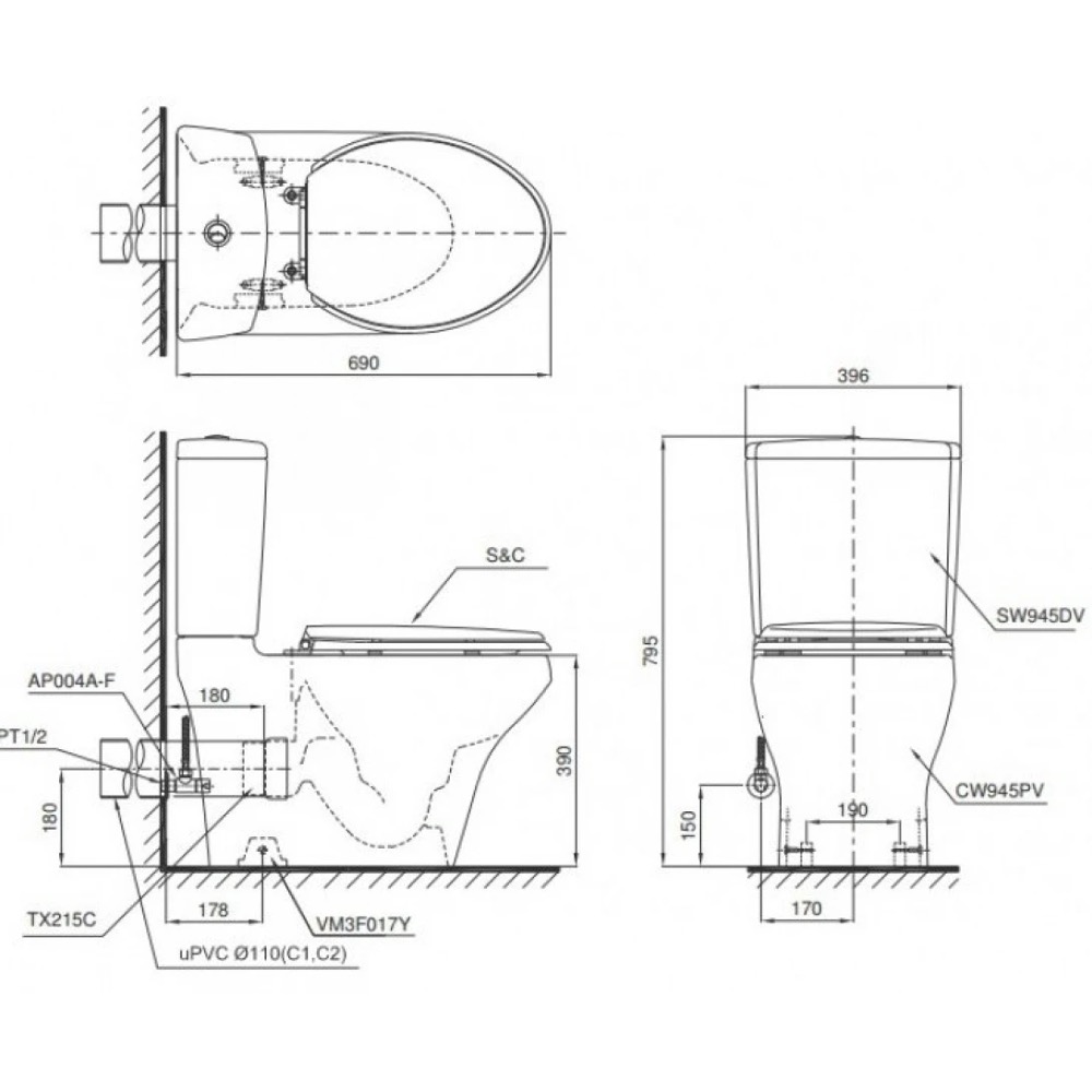 Mô tả sản phẩm Bàn cầu 2 khối nắp đóng êm TOTO CS945PDT10