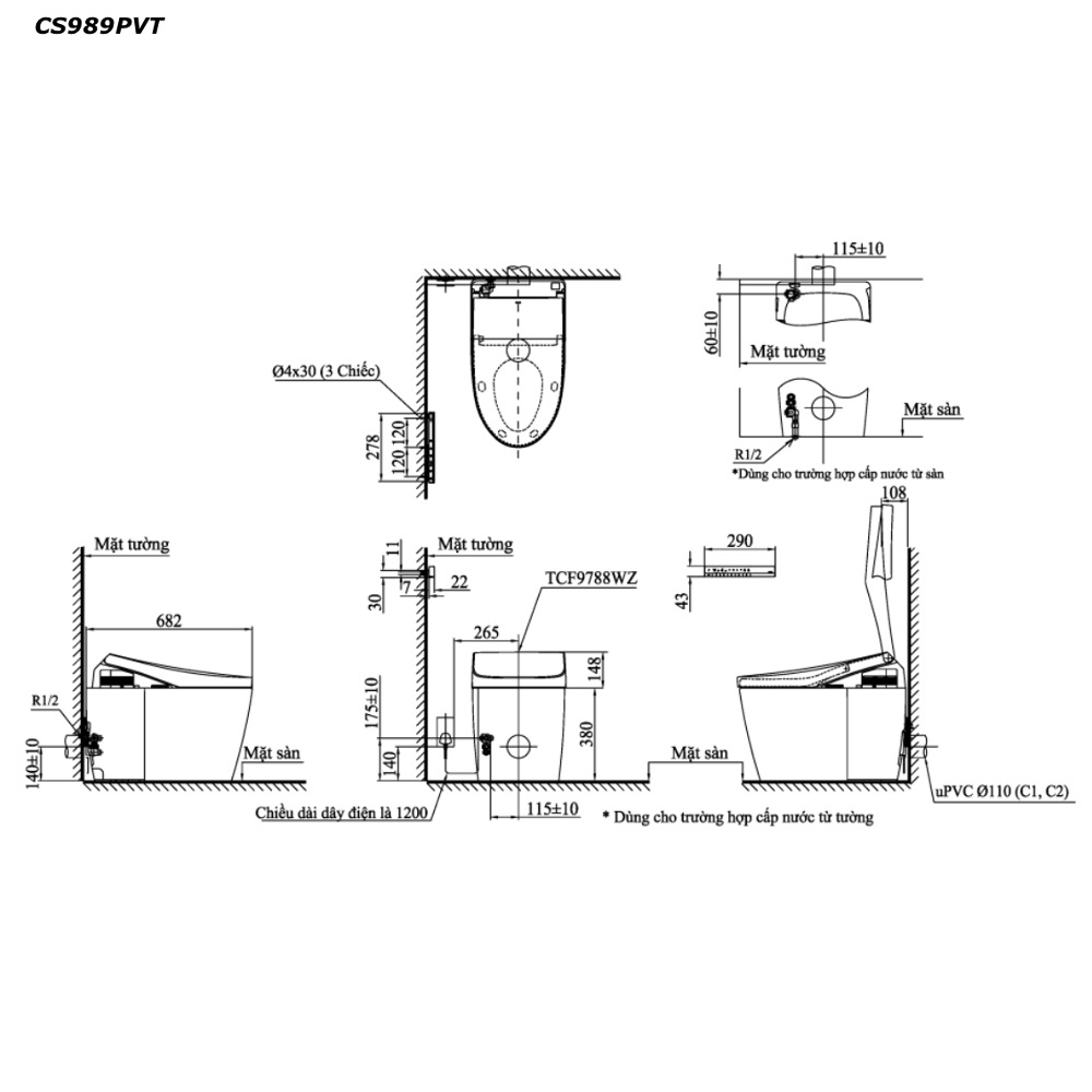 • Nắp rửa điện tử NEW WASHLET tích hợp: công nghệ khử trùng Ewater+, tự động đóng/mở nắp, khử mùi, sưởi ấm nắp ngồi, vòi rửa đa chức năng sấy khô, xả tự động.