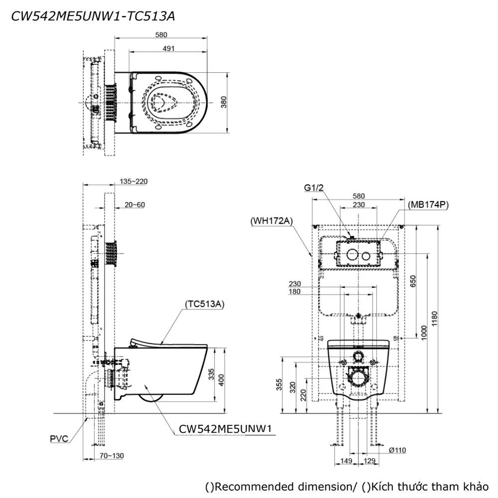 • Bàn cầu treo tường TOTO CW542ME5UNW1 WH172A TC513Alà mẫu bồn cầu treo tường, ưu điểm của dòng bồn cầu này là két nước nằm trong tường, sản phẩm sẽ có tính thẩm mỹ cao hơn so với những dòng bồn cầu thông thường. Thiết kế thân bồn cầu là dáng chữ D với những đường cong mềm mại, thân hoàn toàn kín – vô cùng tiện lợi khi cần vệ sinh sản phẩm.