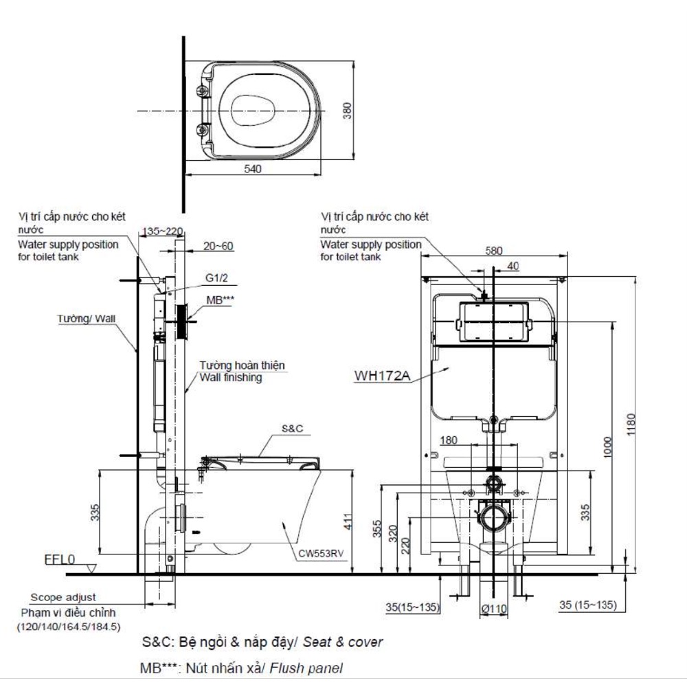 Mô tả sản phẩm Bàn cầu treo tường nắp đóng êm TOTO CW553 TC384CVK WH172A MB170P#SS