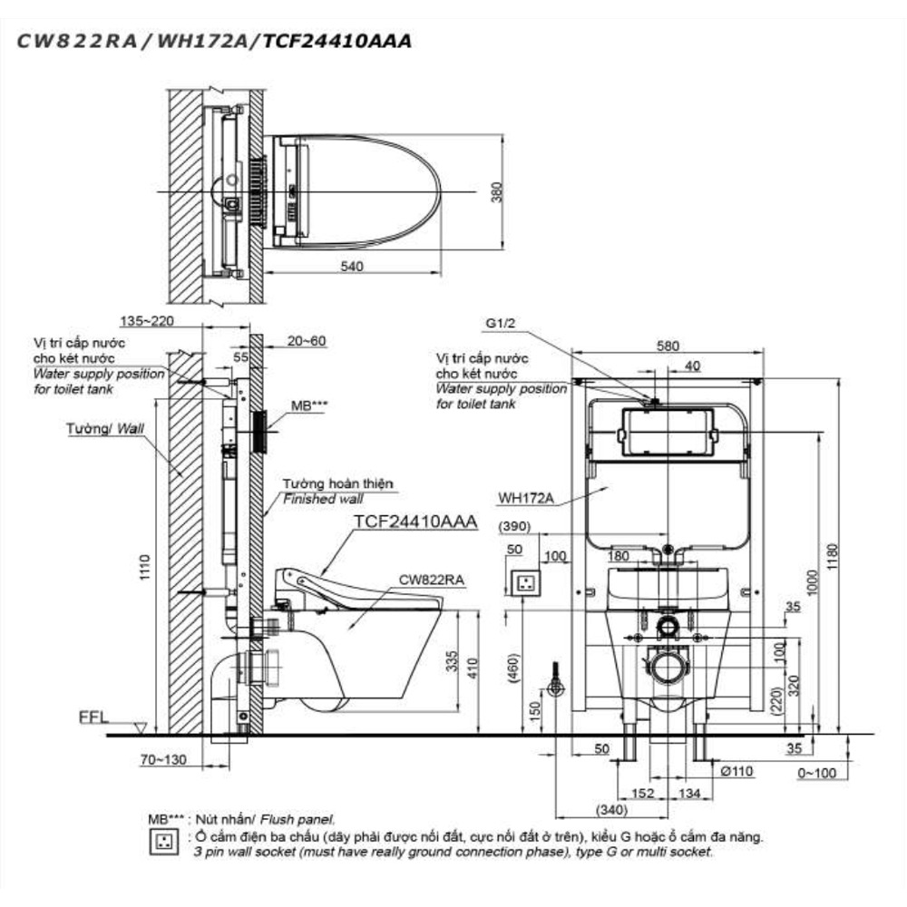 • Thông thường các mã bồn cầu âm tường được cấu thành từ 3 bộ phận cơ bản, két nước âm tường, thân cầu và nút nhấn. Với thân cầu và nắp rửa điện tử thông minh CW822RA/TCF24410AAA​​ bạn có thể tùy chọn thêm các phụ kiện đi kèm đồng bộ như két nước âm tường: WH063R, WH172A và nút nhấn MB170P#SS