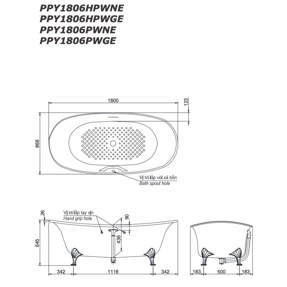 Mô tả sản phẩm Bồn tắm đặt sàn ngọc trai 1800mm TOTO PPY1806PWNE#P