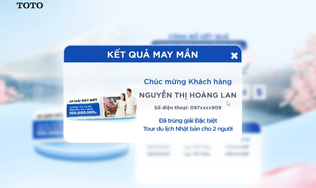 Showroom Minh Phương TOTO hân hoan chúc mừng khách hàng Nguyễn Thị Hoàng Lan đã trúng giải thưởng cao nhất của chương trình Quay Số May Mắn của TOTO Vietnam!